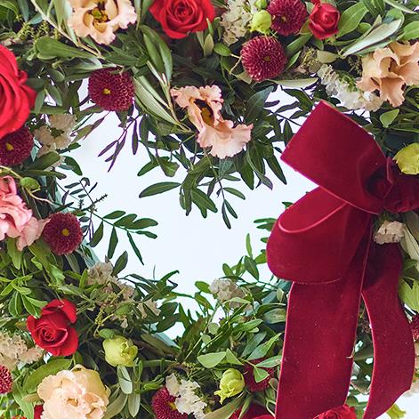 This glorious heart-shaped wreath combines the finest fresh flowers and foliage to create a truly romantic statement. Crafted in beautiful shades of red and pink, each bloom is carefully arranged with lush greenery to bring warmth and elegance to any space.